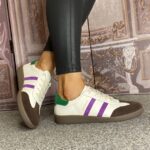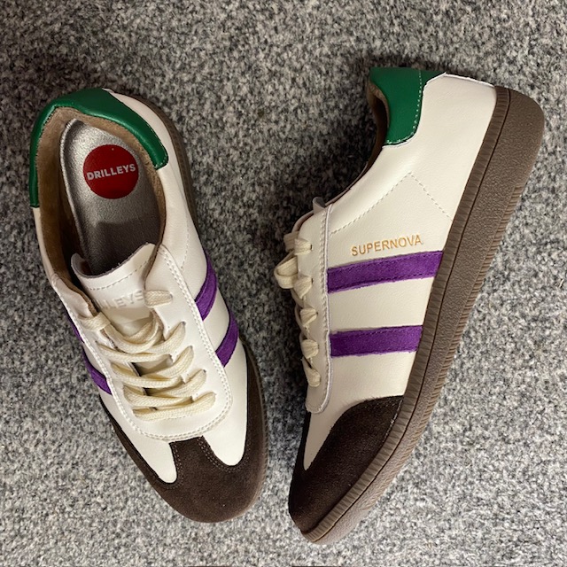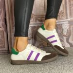 White Leatherette Finish with Chocolate Brown Toe Panel & Purple Stripe Detail with Green Heel Cap.