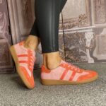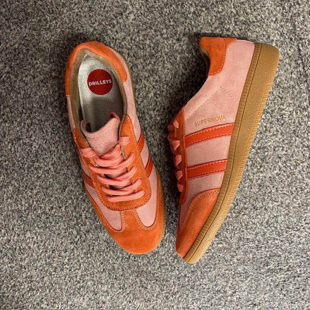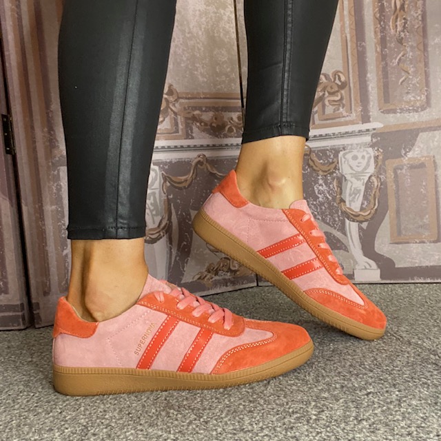 Soft Coral & Orange Suede Finish with Orange Stripe Detail & Heel Cap.