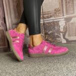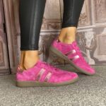 Hot Pink Suede Finish with Metallic Pink Stripe Detail & Heel Cap.