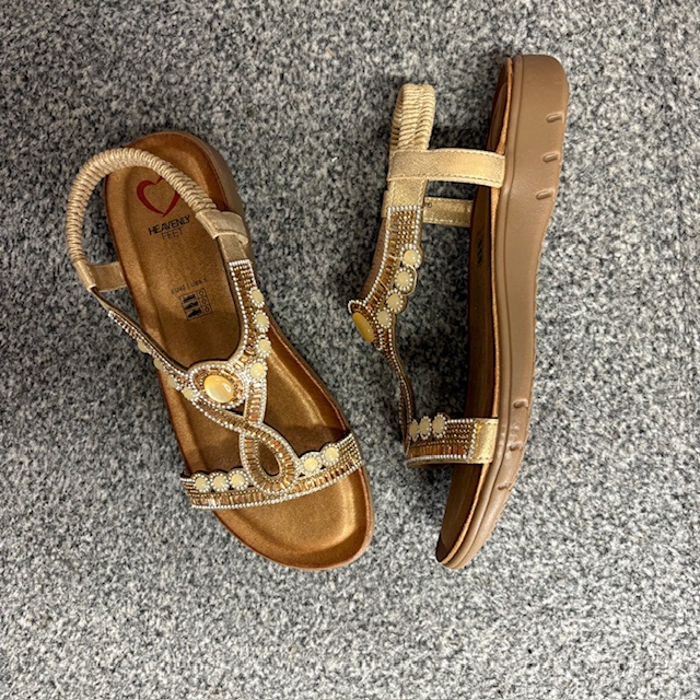 Heavenly Feet, vegan friendly, comfort sandal style, Glamour. Featuring an intricately embellished T-bar upper with striking bead and gem detailing, this vegan-friendly sandal is designed to stand out. The elasticated heel strap ensures effortless wear, while the cushioned footbed keeps you comfortable from day to night. A perfect choice for summer events, holidays, or adding sparkle to your everyday wardrobe.