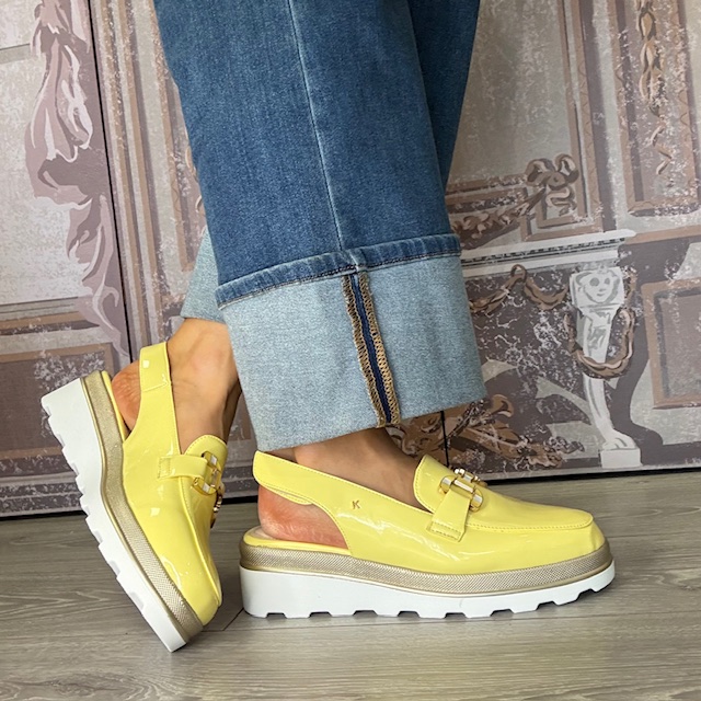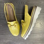 Sunflower yellow, patent finish with yellow and white horsebit link hardware.