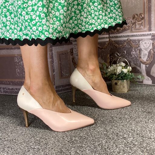 Pale Blush Pink, white and gold multi tonal mix, pointed toe court shoe.