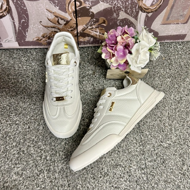 Gold trimmed white lace up closure and gold tipped tongue.