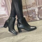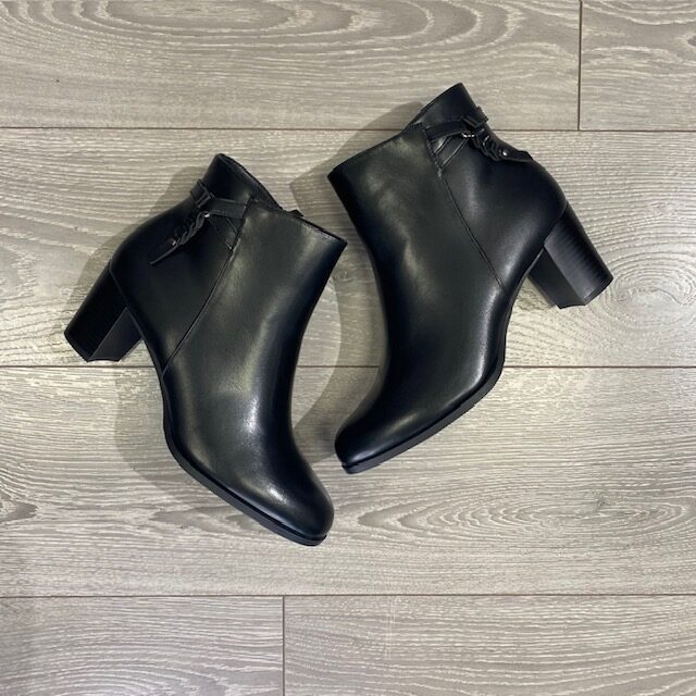 Una Healy “Fly Away – Vinyl” Block Heel Ankle Boot.
