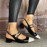 Black and white, patent finish, slingback shoe.