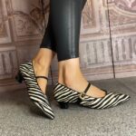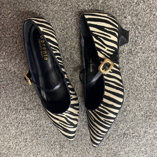Black and white, zebra print Mary Jane style shoe.