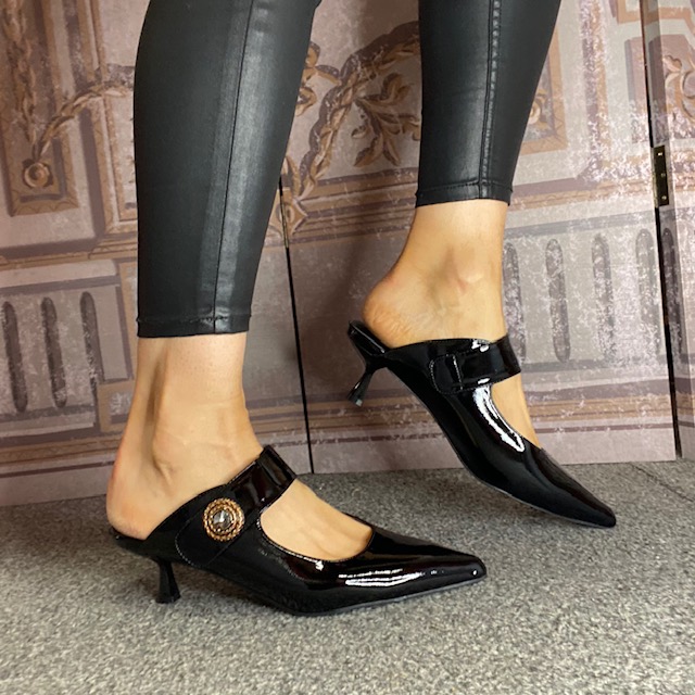 Black patent, slip on style heeled mule.