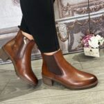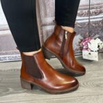 Tan block heel genuine leather ankle boot.