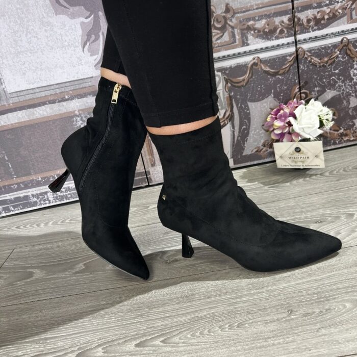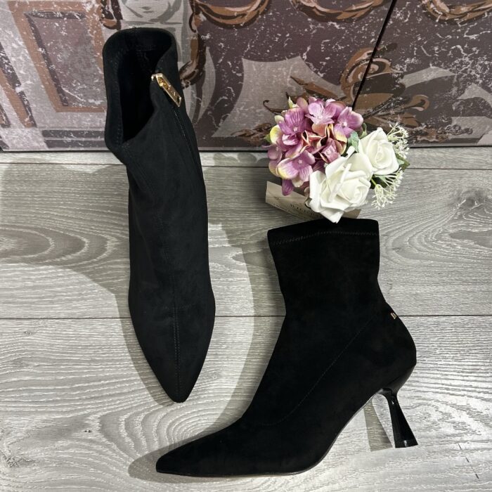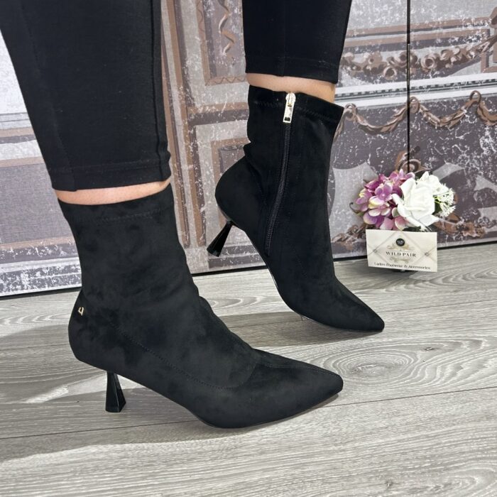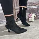 Stretchy material with pointed toe and inner zip closure.