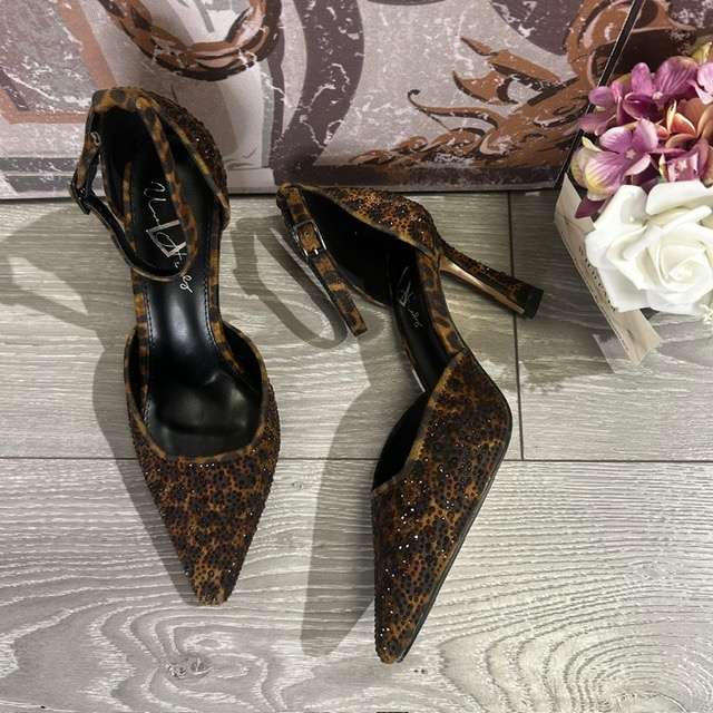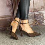 Classic pointy toe with slim leopard print buckled ankle strap.