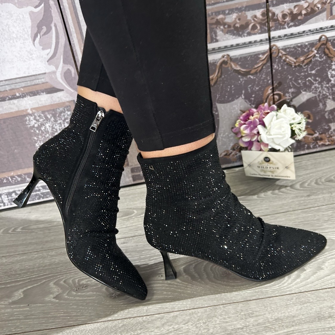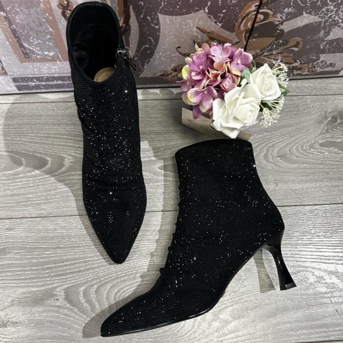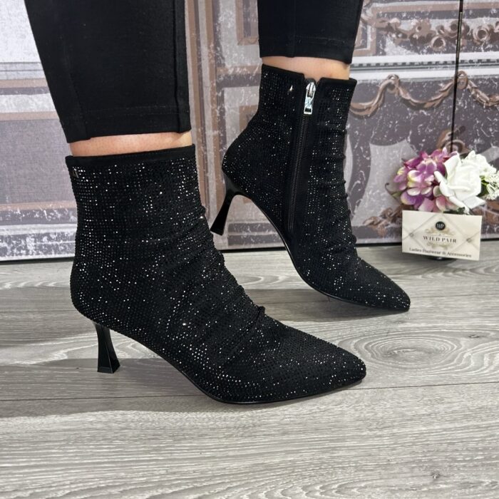 Black sparkle ankle boot with ruched front.