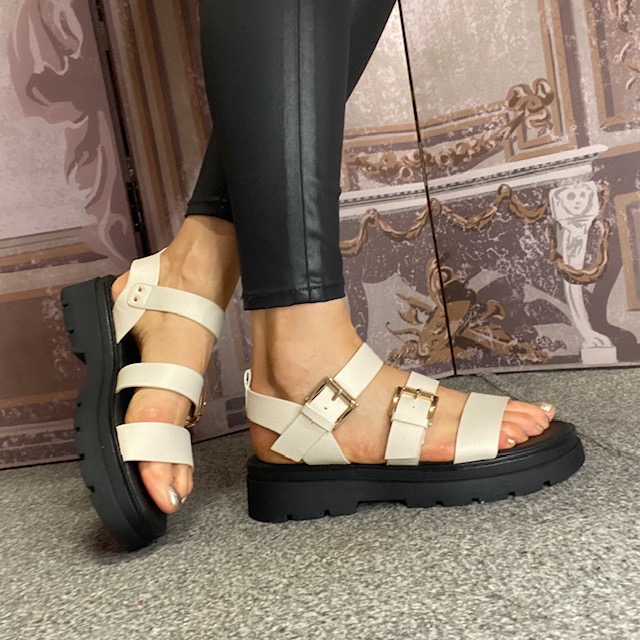 Trio strap with two golden buckle closures.