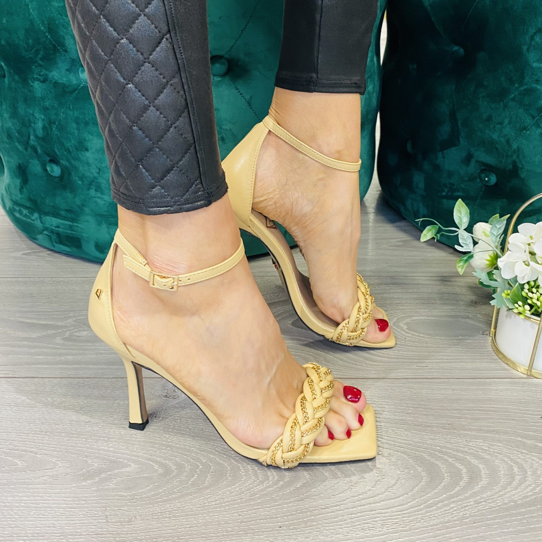 Deep Cream Sandal with a Braided Strap & Gold Chain Detail.