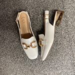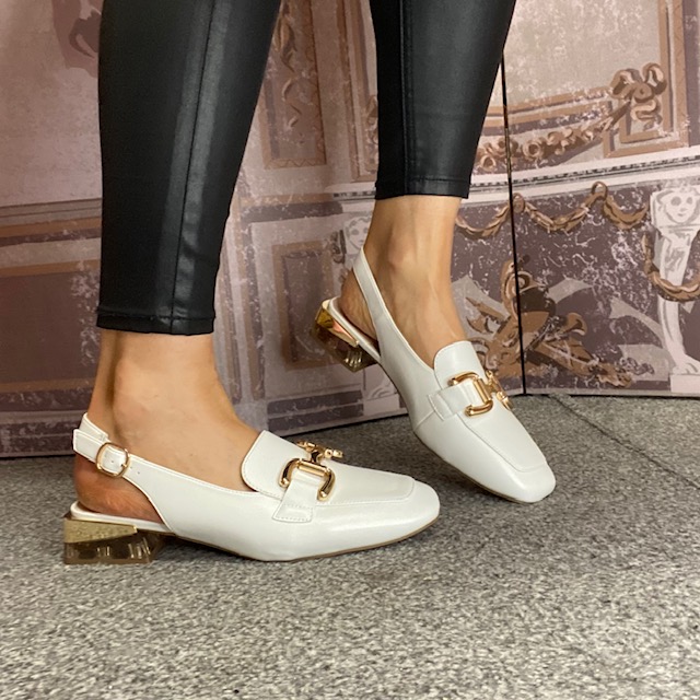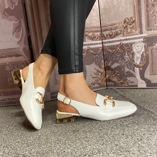Slingback, ankle buckle closure.