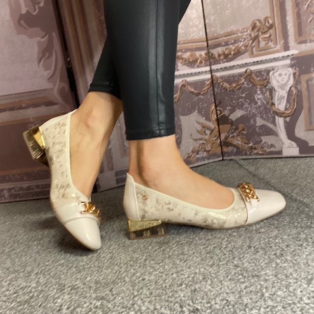 Softly squared, patent cream toe.
