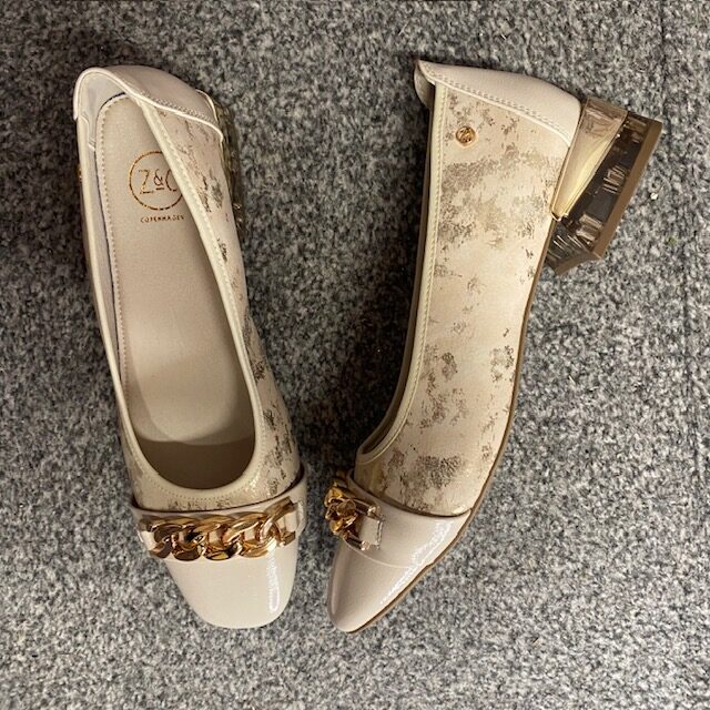 1″ perspex & gold detailed block heel.