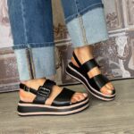 Double front strap with adjustable buckle closure.
