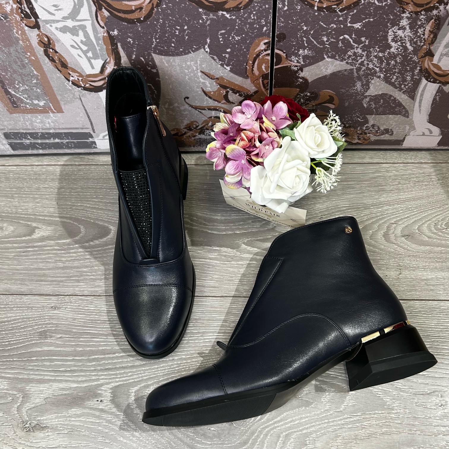 Navy ankle boot with black diamante tongue.